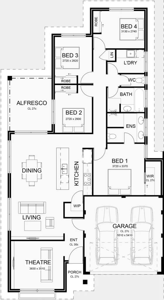 The Meadow boasts modern planning and design with this compact and luxurious family home. With 4 bedrooms, an alfresco dining area, and a simple living area packed into 199m2, this home suits urban properties and country-living families alike.
